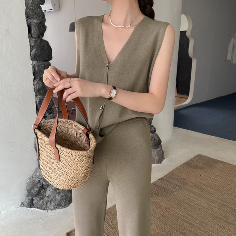 レディース 2点ニットセット オフィスカジュアル セットアップ ノースリーブ ベスト 体型カバー ワイドパンツ きれいめ
