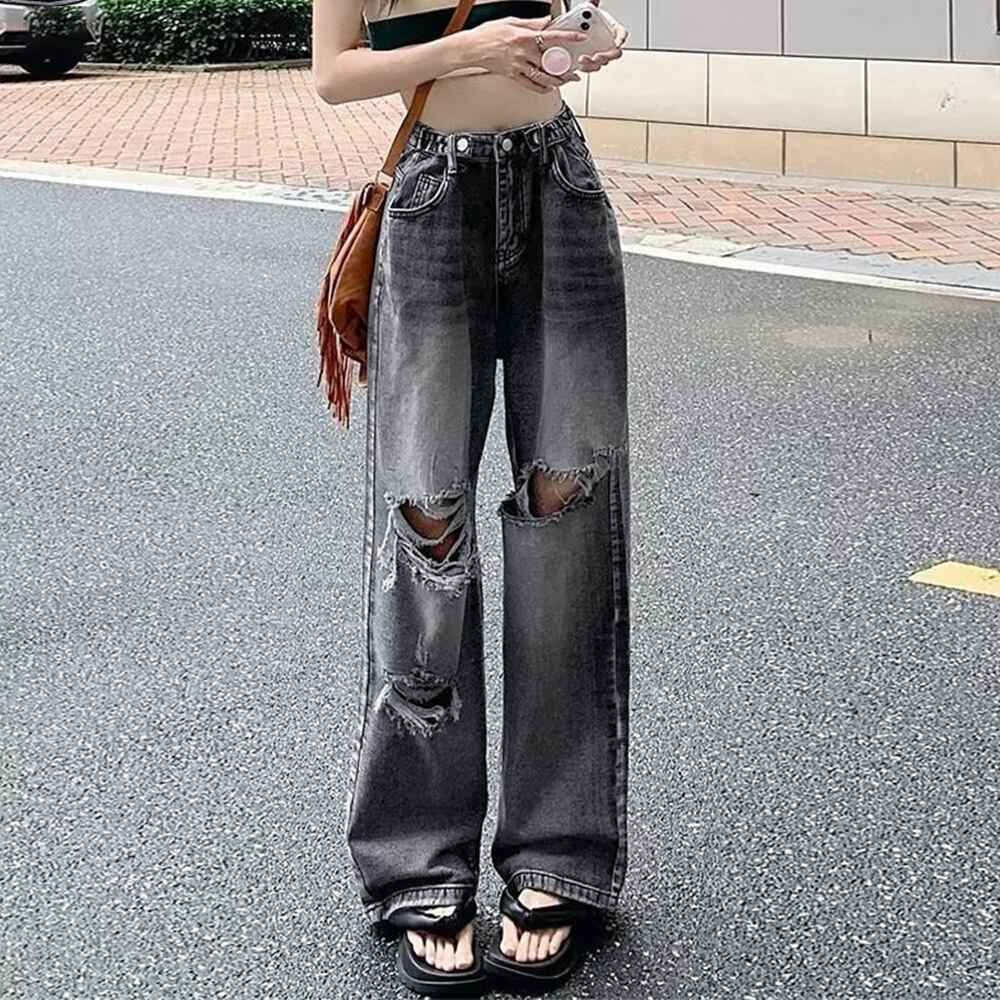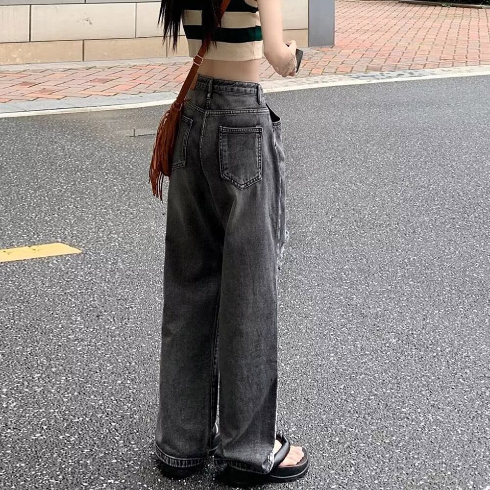 韓国ハイウエスト カジュアル ストレートジーンズ クラッシュデニムパンツ ウォッシュ加工 ストリート ジーパン おしゃれ