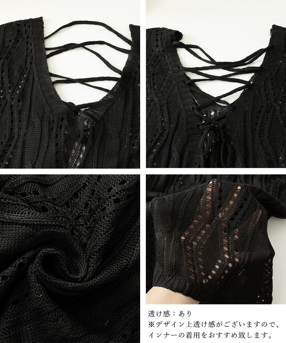 【ブラックのみ】透かし編み ニットトップス レースアップ