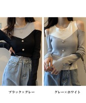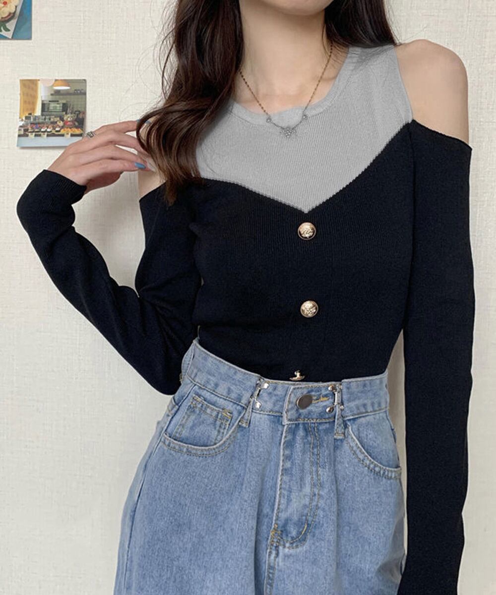 トレンド感あふれる肩出しデザインとバイカラーがポイントのニットトップスです。