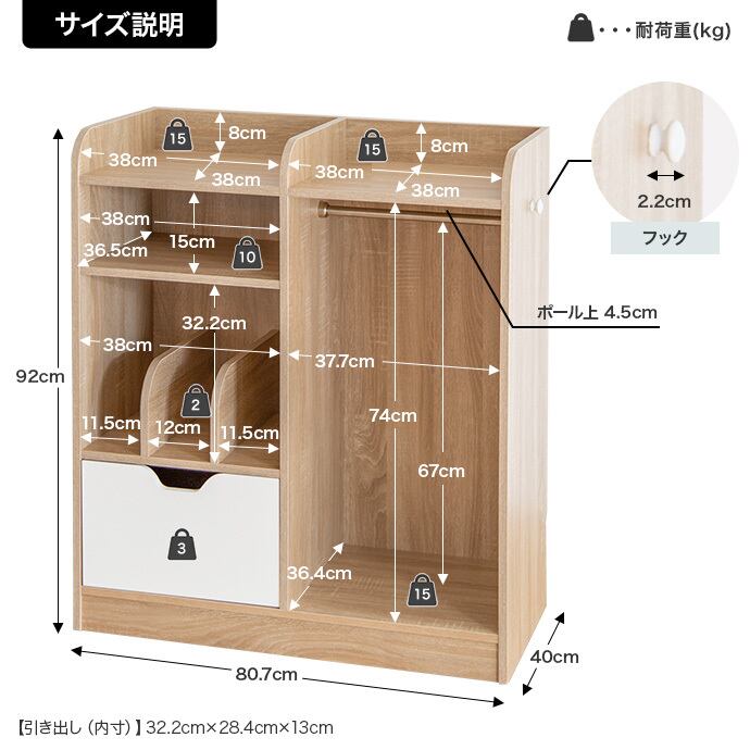【耐荷重】(天板)約15kg、(各棚)約10kg、(引き出し)約10kg、(ハンガーラック底板)約15kg、(ハンガーポール)約7kg、(フック)約15kg