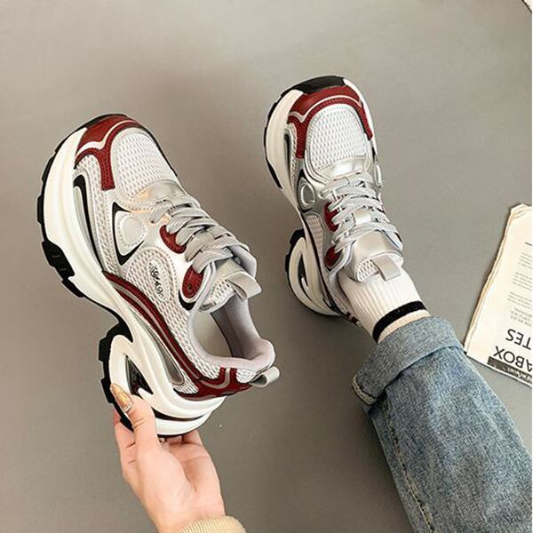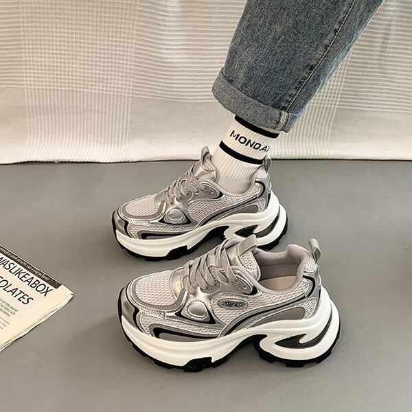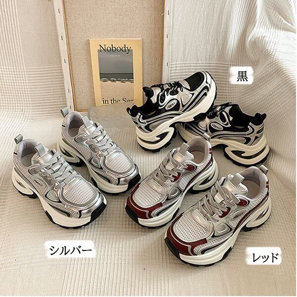 2025新作 レディース メッシュスニーカー 紐靴 シューズ ボリュームソール 厚底 美脚