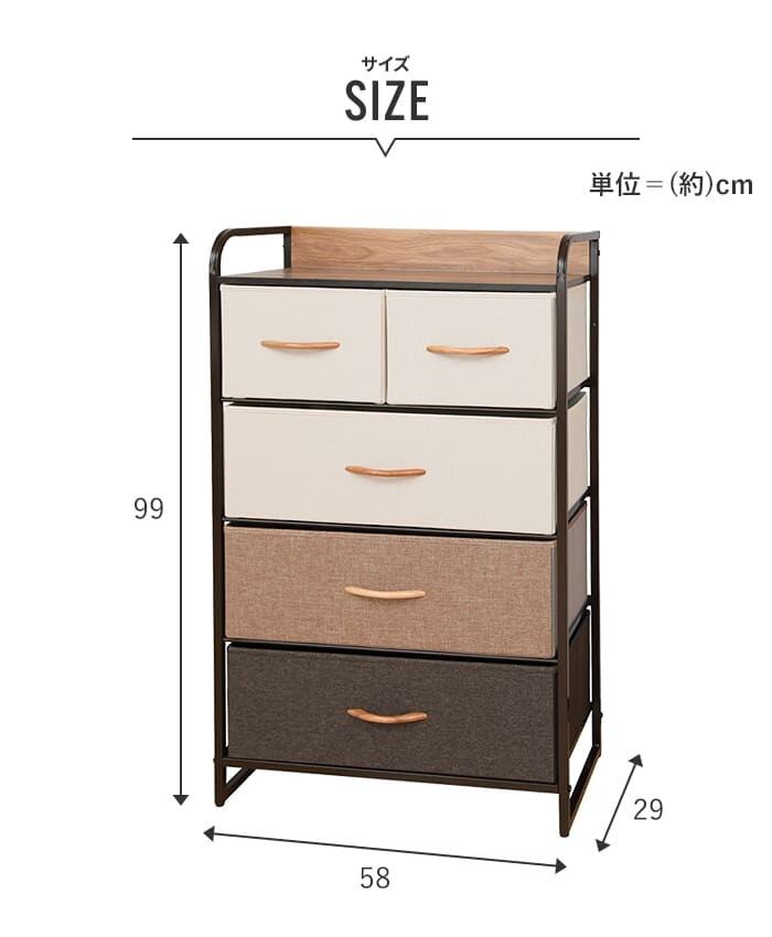 木目と布地がおしゃれでシンプルな布張りカラーチェスト、4段5杯タイプです。